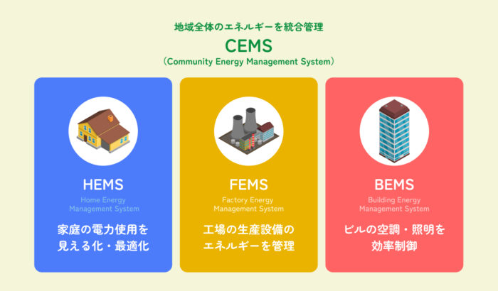エネルギーマネジメントシステム(EMS)には、対象施設に応じて複数の種類が存在します。なかでもCEMSは地域全体を統合管理する上位概念にあたり、HEMS・FEMS・BEMSはそれぞれ家庭・工場・ビルという個別施設を対象とするシステムです。