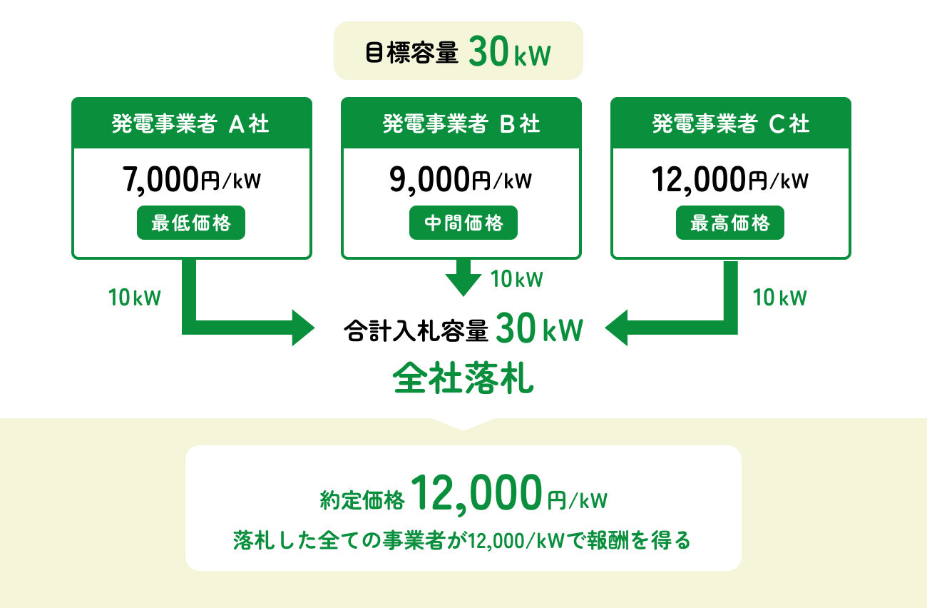 A社(7,000円)+B社(9,000円)+C社(12,000円)でちょうど30kWになるため、約定価格は最後に落札されたC社の12,000円/kW。落札した全ての事業者が12,000円/kWで報酬を得ることになります。