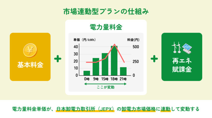 市場連動型プランとは、電力量料金単価が、日本卸電力取引所(JEPX)などの卸電力市場価格に連動して変動する料金プランを指します。
